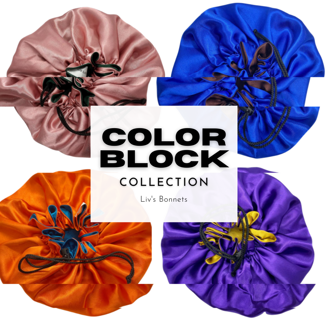 The Color Block line of medium and large bonnets brings together contrasting colors in the most beautiful way. These reversible satin drawstring bonnets are perfect for protecting your coils and curls.